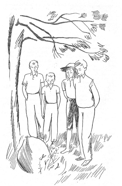 Сорока, Серёжа, Алёнка и Гарик у камня на могиле Смелого