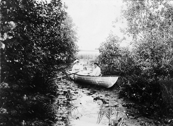 Катание на лодке. Ручей между озерами Островито и Немегой. Межутоки, июнь 1906 г. Ручей течёт под мостиком у нынешнего въезда на базу. По рассказам старожилов в старину мостика не было, - только брод. Сейчас ручей зарос и почти не виден, а в старые времена за ним следили, чистили, весной ставили в начале и в конце ручья «норота», чтобы рыба могла входить, но не могла выходить, и ловили её сачком!