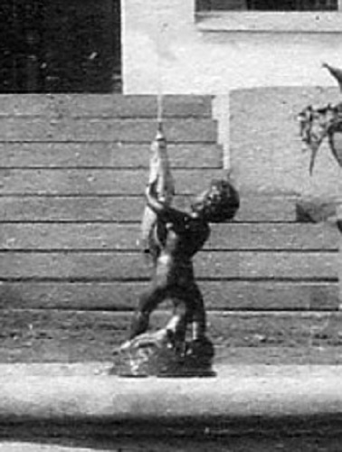 У противоположного, южного фасада дома оборудовали фонтан - круглый бассейн, в центре которого стояла фигура обнажённого мальчика, державшего рыбу, изо рта которой била струя воды.