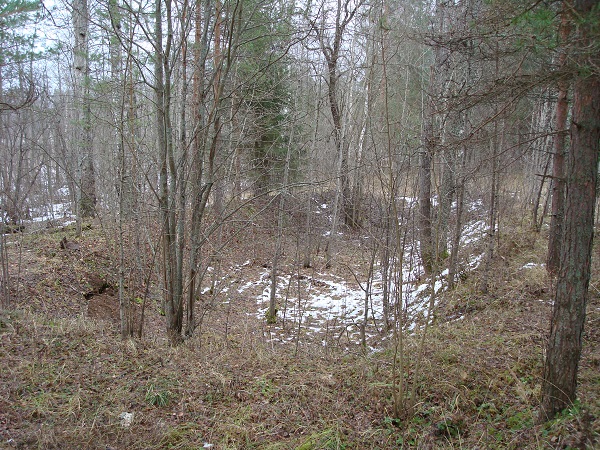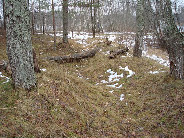 Окоп (зигзагообразная «щель») для укрытия расчёта зенитной установки. Межутоки, ноябрь 2008 г. Когда я рассказал о своей находке своему здешнему знакомому, работнику базы Палычу, он показал мне ещё одну позицию зенитчиков на противоположном берегу протоки, на холме возле дороги, поднимающейся от моста к гравийке, идущей из Ильятино в Погарино. Остров Межутоки оказался удобным местом для размещения зениток, поскольку над озёрами открывались хорошие сектора для стрельбы по самолётам противника. Зенитка на берегу усадьбы простреливала северный сектор неба, а та, что за протокой на холме – южный. После этого стало понятным назначение двух похожих выемок в холме недалеко от пристани «Гриб» на берегу Островито напротив Никифорова (Каменного острова). Эти две зенитки простреливали западный сектор неба. К сожалению, нельзя сказать однозначно, чем были вооружены расчёты зенитчиков в Межутоках. Это могли быть установки 4-М, представлявшие собой счетверенные пулемёты «Максим» винтовочного калибра 7,62 мм, либо автоматические зенитные пушки калибра 37 мм образца 1939 года. С одной стороны, размеры оборудованных позиций говорят скорее о небольших пулемётных установках, но площадка для боеприпасов явно позволяла хранить достаточное количество ящиков со снарядами для пушек.