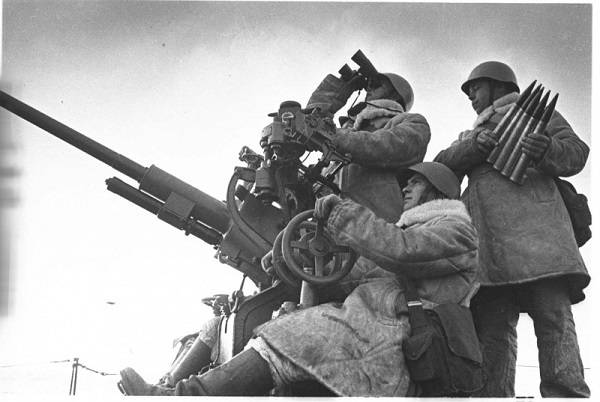 Расчет зенитной пушки ведет огонь
