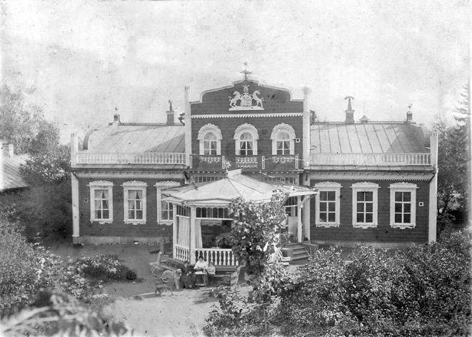 Старый усадебный дом Аничковых с мезонином и фамильным гербом. Северный фасад. Межутоки, 1906 г.